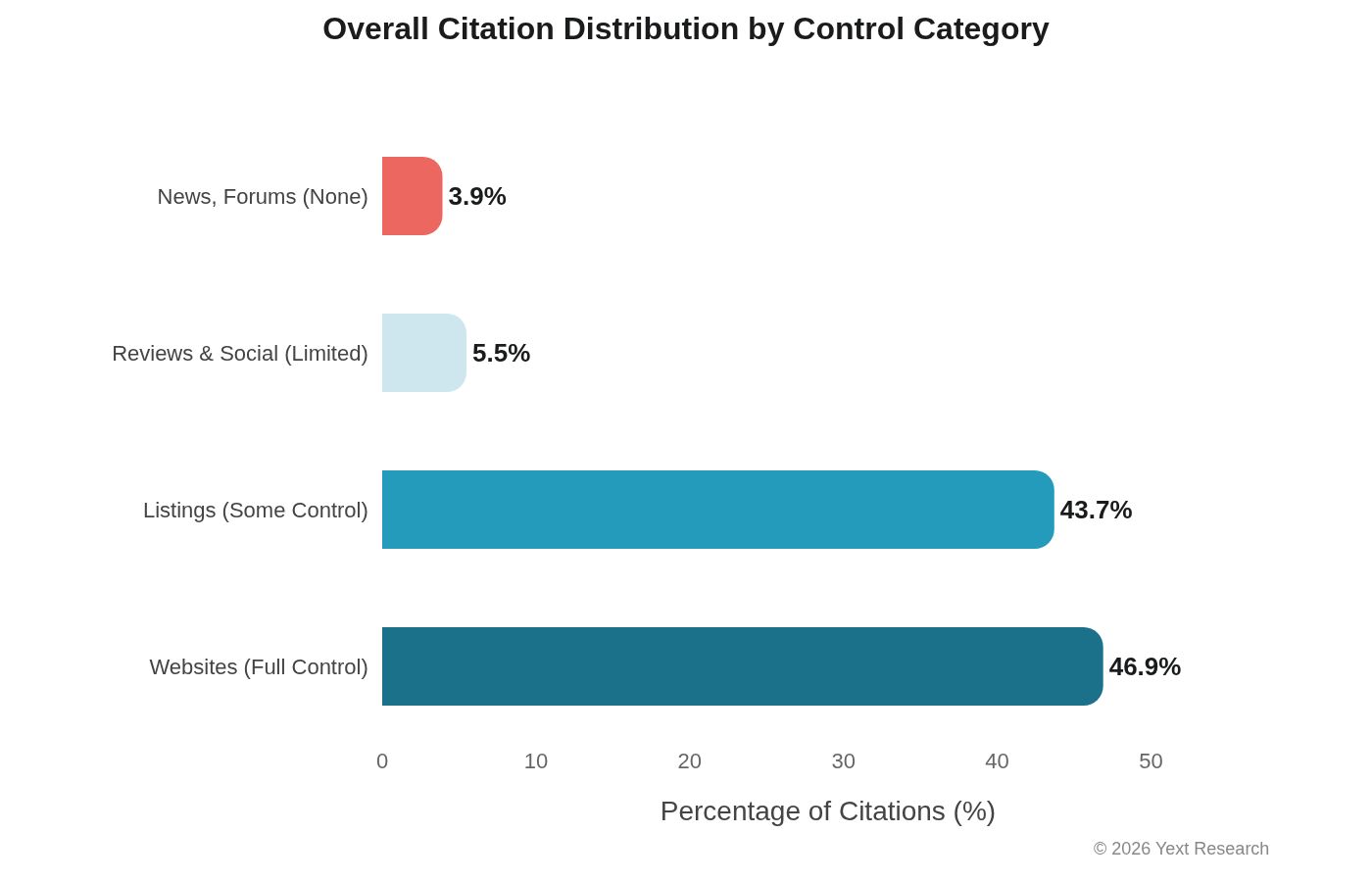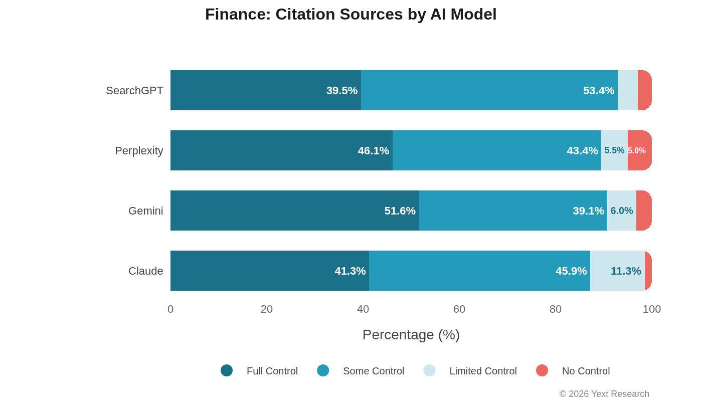 - Limited & No Control (moins de 10 %) : Contrairement aux idées reçues, les sources totalement indépendantes comme la presse, Reddit ou les forums pèsent peu dans les citations liées aux services par rapport aux sources structurées.