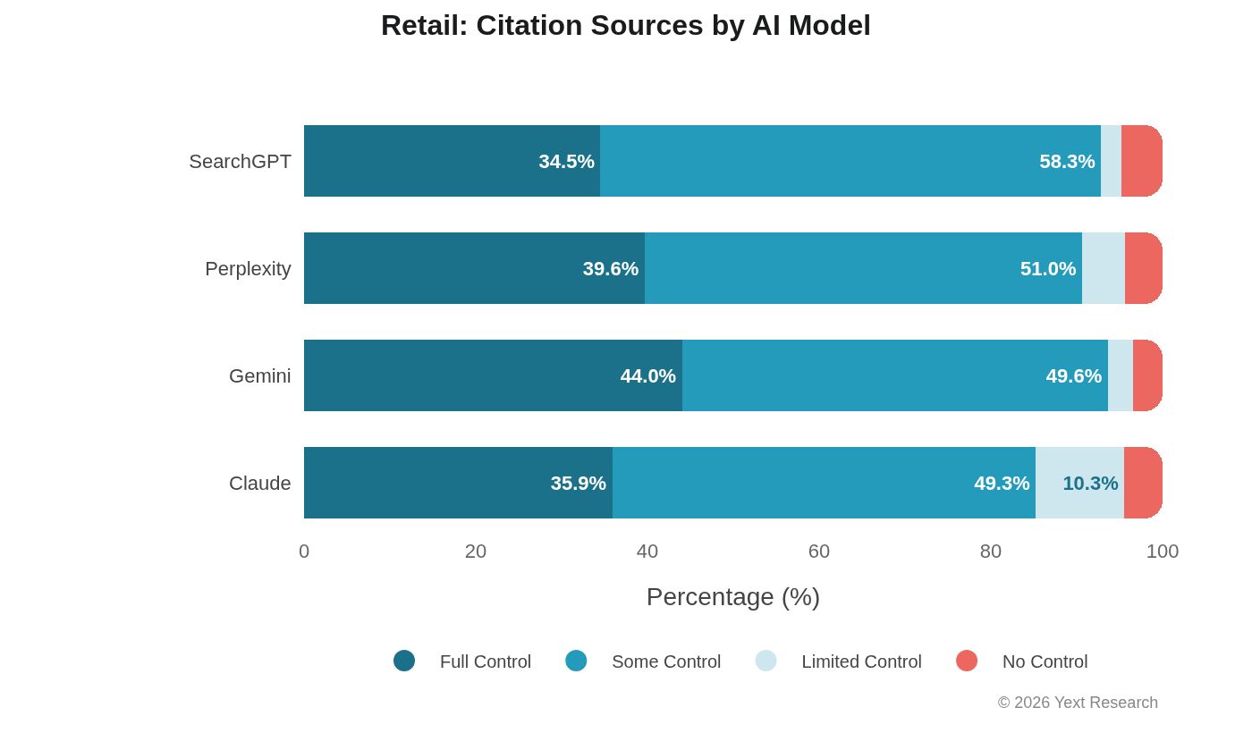 - Retail : C'est le secteur où le Some Control (listings, fiches produits) explose, représentant souvent plus de 50 % des citations. L'exactitude des informations locales y est critique.